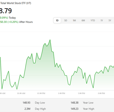 As of April 16, 2026, Vanguard Total World Stock ETF (VT) is around $148.79 and is up about 5% year to date.